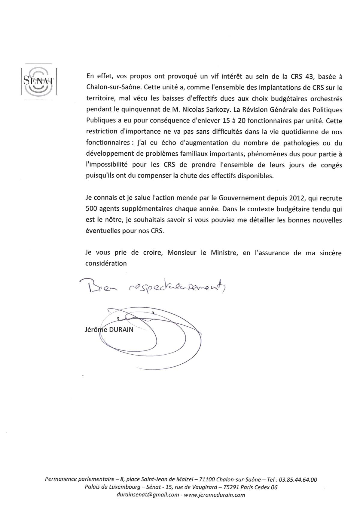 Jérôme Durain a souhaité adresser à Bernard Cazeneuve, Ministre de l’Intérieur, afin d’attirer son attention sur le manque d’effectif de la CRS 43, basée à Chalon-sur-Saône.